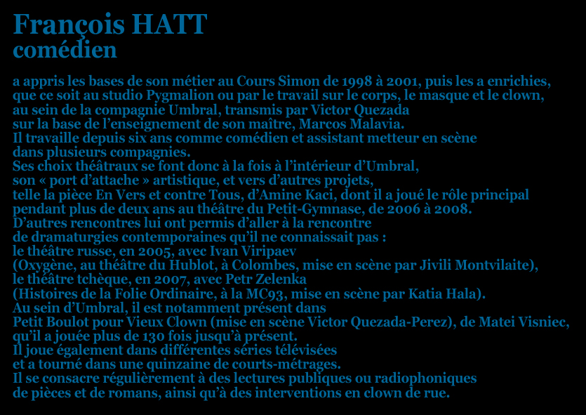 Nous avons pris le parti d’intégrer un personnage extérieur : le lecteur (interprété par Frank Horvat). Il est le fil conducteur de ce spectacle.