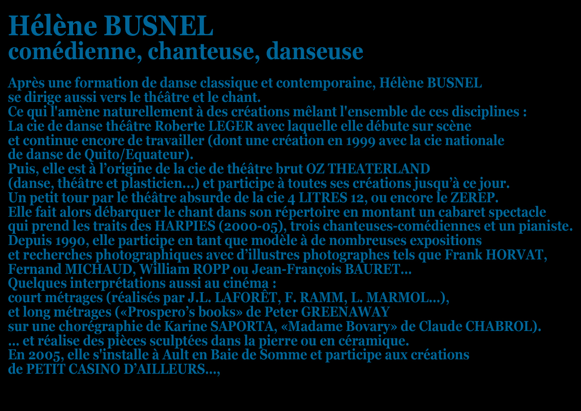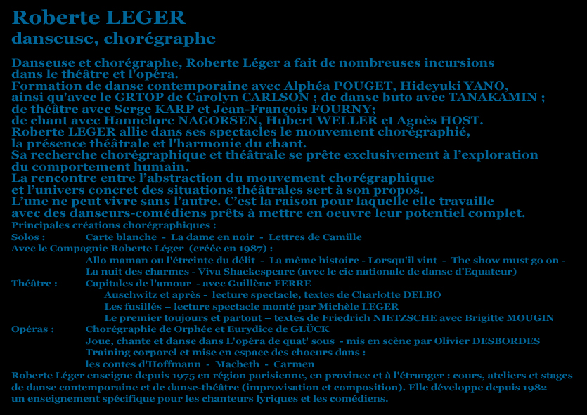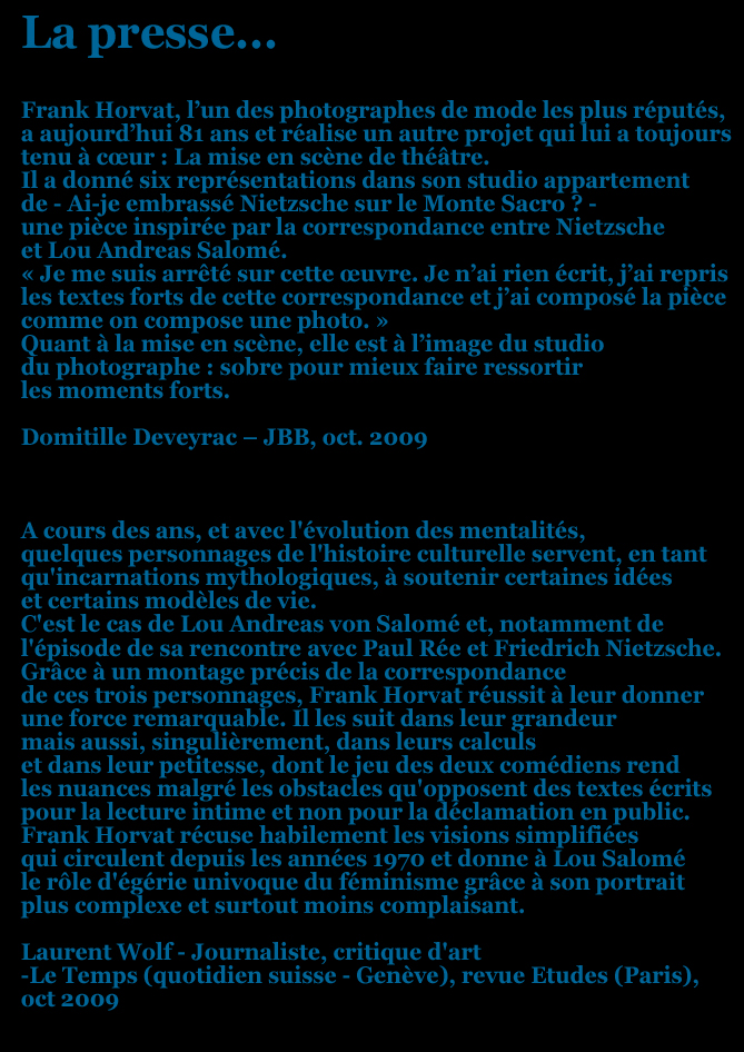 Lou (interprétée par Hélène Busnel), personnage central et pivot de ce spectacle, entourée des autres protagonistes (tous interprétés par François Hatt). Maniant à la fois la danse, le chant mais surtout le théâtre, nous jouons sur le fil ténu de l’interprétation vivante. Il y a les mots, la musique (notamment un poème de Lou mis en musique par F. Nietzsche, mais aussi les musiques de Wagner, ami-ennemi du philosophe), et le geste dansé, ou le moyen de transposer le contour des mots en expression charnelle. Par le support de cette correspondance, nous avons pu dessiner cette tranche de vie, dans laquelle trois personnages hors du commun vont se frotter intellectuellement, se mesurer à leur propre soif de savoir…